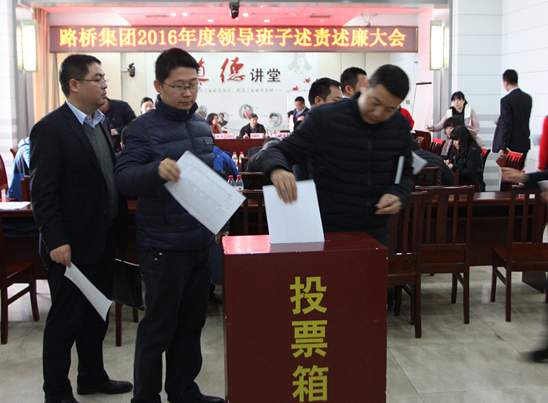 会上,路桥集团党委书记、执行董事、总经理周俊代表路桥集团领导班子作了2016年度述责述廉报告。周俊指出,2016年是路桥集团战略发展、深化布局的关键之年,在联投集团党委的正确领导下,公司定位紧密围绕集团战略转型思路、践行管党治党、从严治党责任,切实履行领导干部"一岗双责",较好地完成了各项工作任务。一是通过强化组织领导、强化关口前移、健全责任体系,突出排查问责等不断强化党委主体责任,推进公司党风廉政建设。二是注重党风廉政建设与经营管理相结合,积极谋求新常态下战略发展新思路,积极探索内部管理新机制,依靠科技创新培训发展新动力,推动经营业绩提升。三是突出重点,加强思想教育,强化责任落实,全面履行党风廉政第一责任人责任。