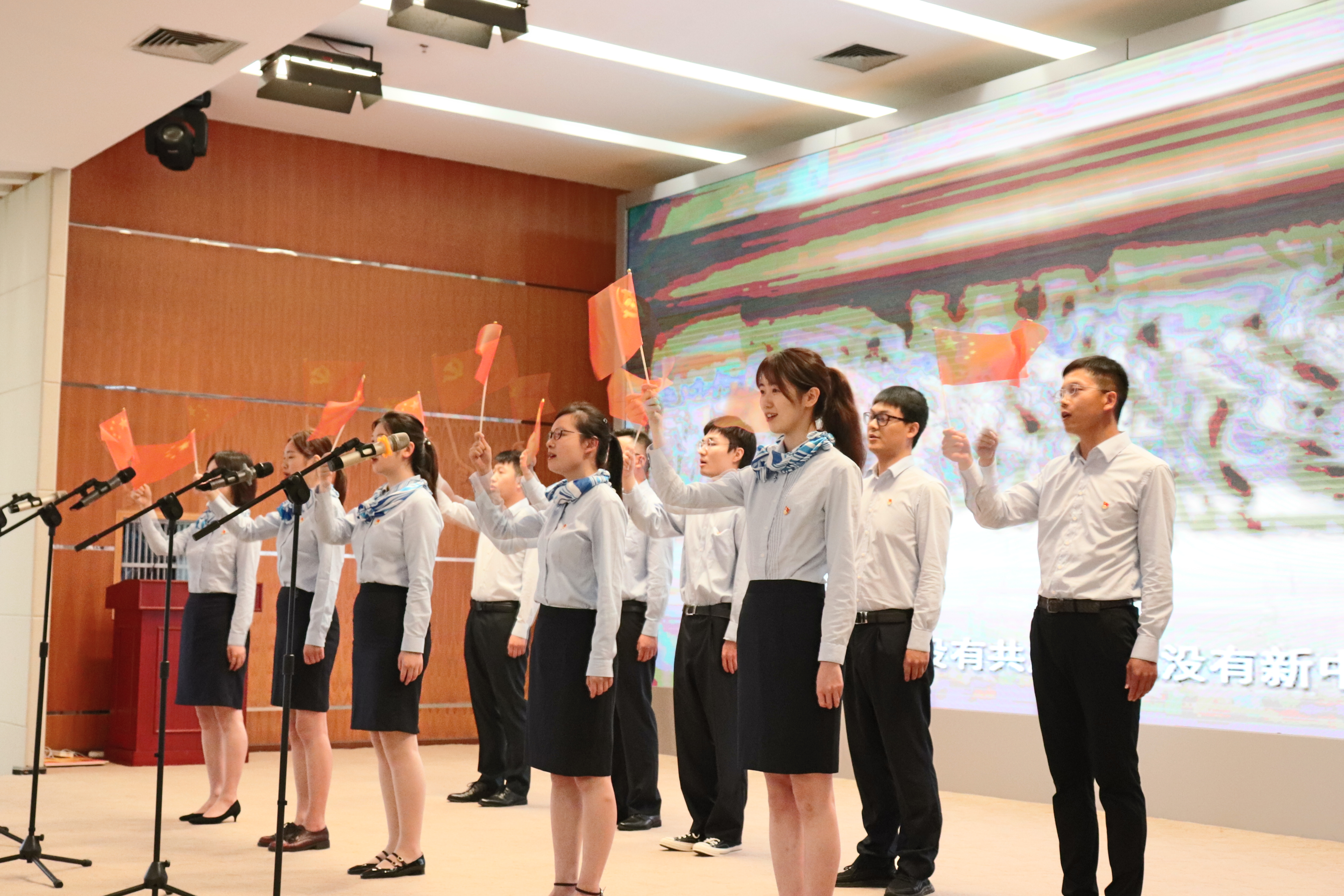 “没有共产党就没有新中国......”与会人员挥舞党旗与国旗,高声齐唱《没有共产党就没有新中国》赞歌。深情嘹亮的歌声响彻会场,那朴实的歌词、滚烫的旋律,如旗帜,似号角,一字一句都表达了对党的信念如虹和拳拳赤子心。会场气氛瞬间推向高潮!