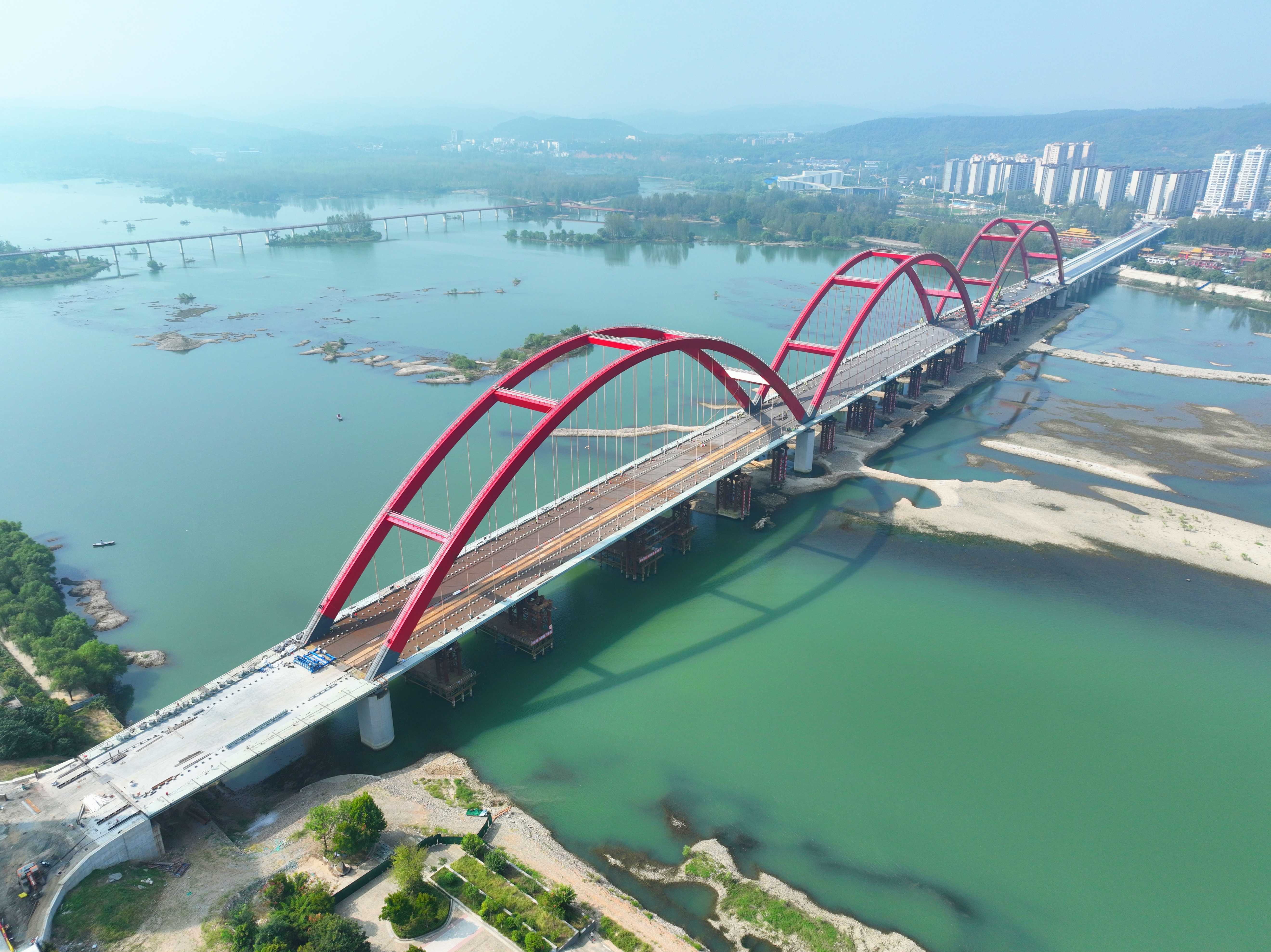 是国内最长的三跨连续钢箱系杆拱桥。