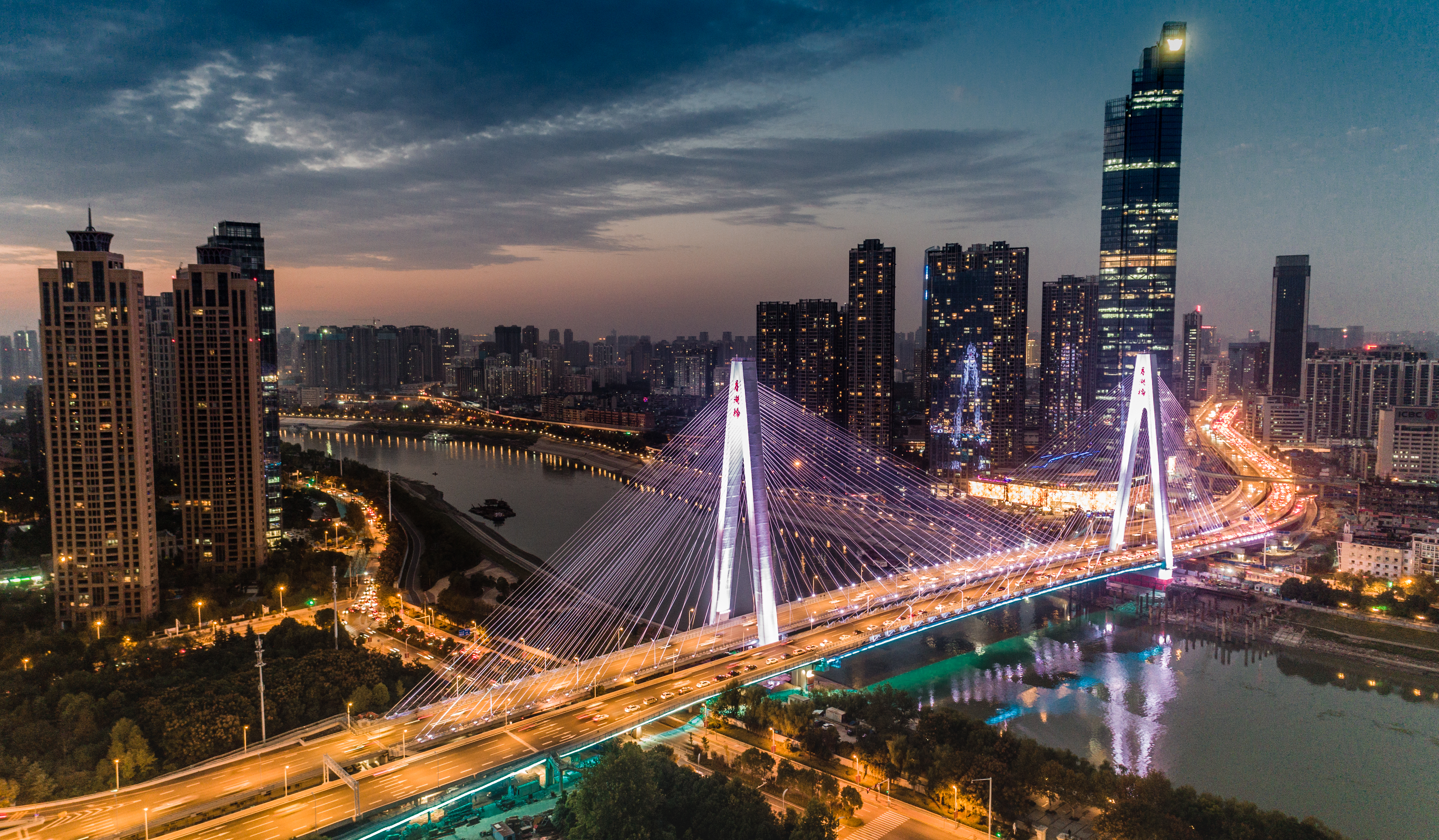 江汉四桥工程南起汉阳梅子山通道,北至汉口京汉大道,全长约1.86KM,主线按城市快速路标准建设,设计时速60KM∕h、设双向6车道,地面辅道按城市次干路标准建设,设计时速40KM∕h、设双向4-6车道。工程内容主要包括:拓宽既有梅子山通道、新建江城大道下穿琴台大道地下通道、在既有月湖桥下游新建一幅跨江大桥及两岸引桥、新建琴台大道上跨江城大道高架桥,以及相配套的人行天桥、通道、道路排水、交通、绿化、照明等工程。项目于2018年8月31日建成通车。