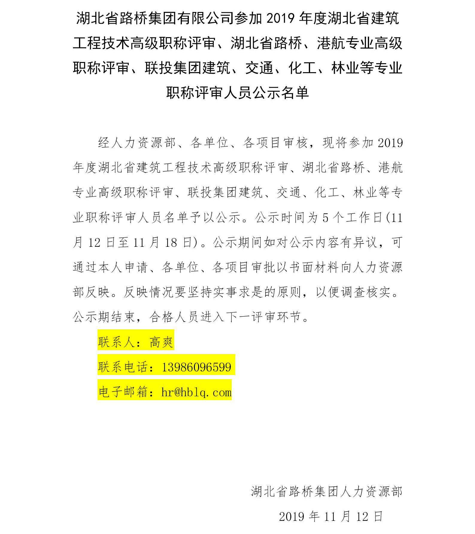 乐鱼官方网站参加2019年度湖北省建筑工程技术高级职称评审、湖北省路桥、港航专业高级职称评审、联投集团建筑、交通、化工、林业等专业职称评审人员公示名单