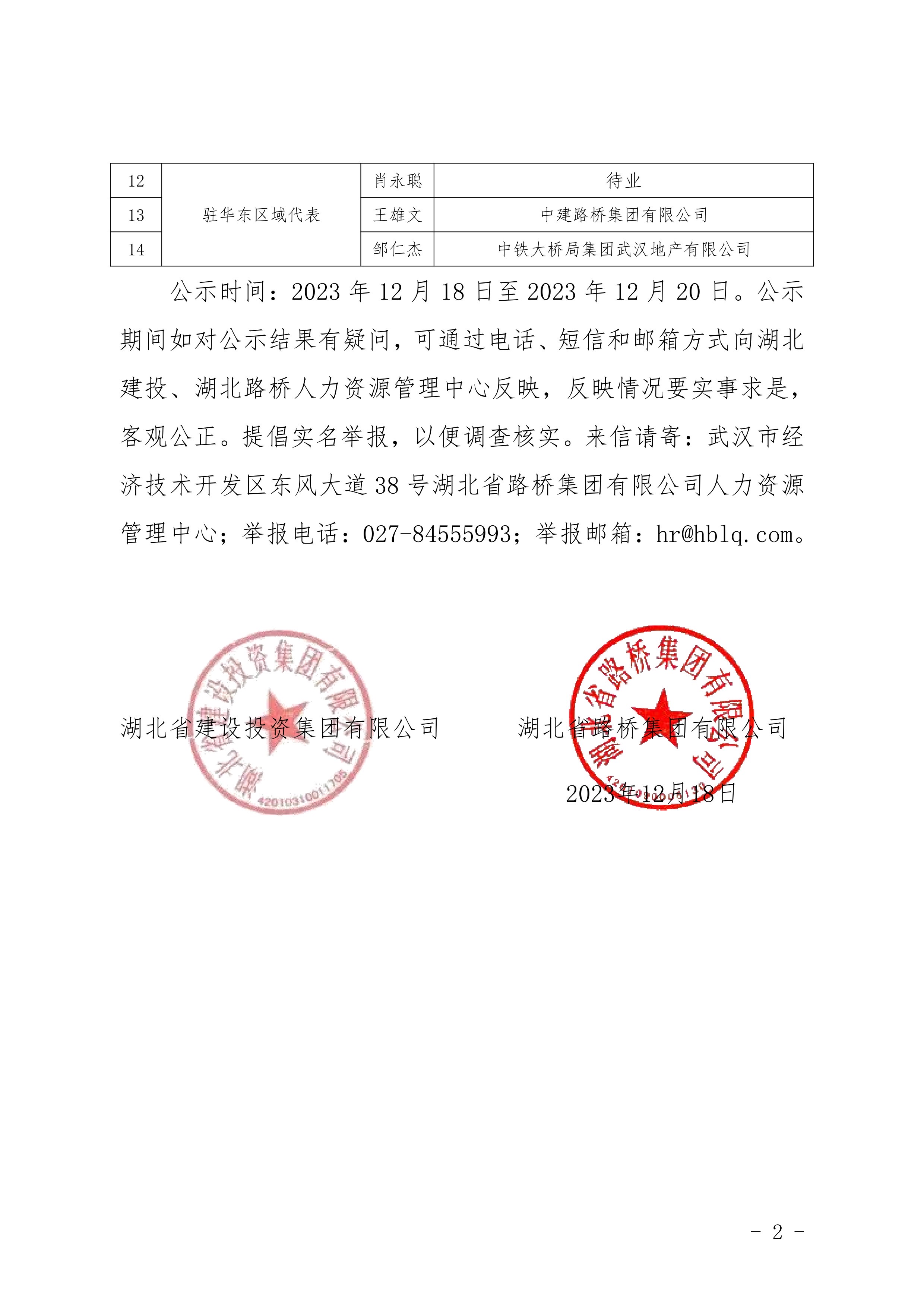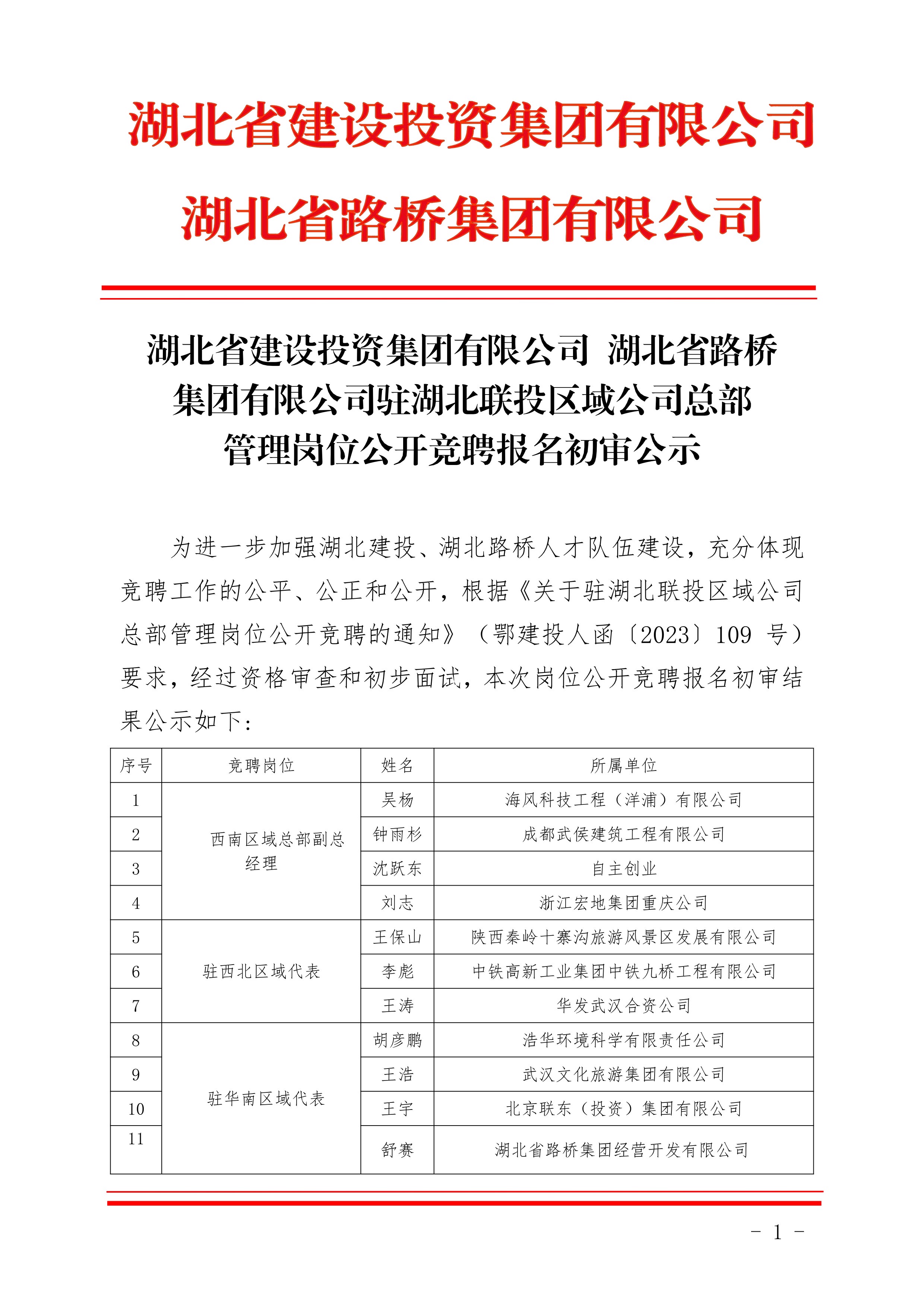 湖北省建设投资集团有限公司、乐鱼官方网站驻湖北联投区域公司总部管理岗位公开竞聘报名初审公示