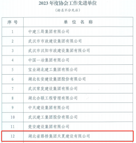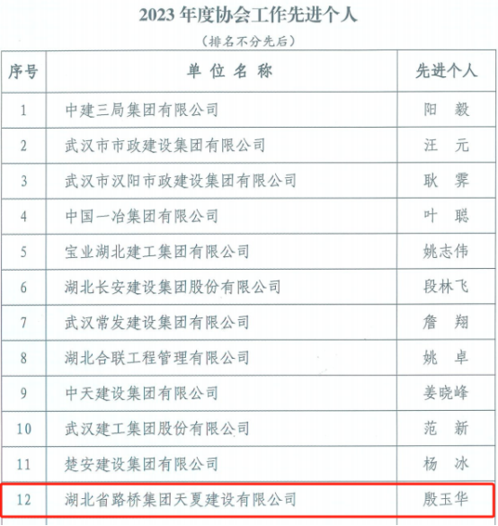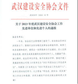 初心如磐守安全,砥砺奋进谱新篇。近日,武汉建设安全协会就2023年建筑行业安全生产方面评选了一批先进单位和先进个人,湖北路桥天夏公司荣获“2023年度协会工作先进单位”称号,天夏公司副总经理殷玉华、安全总监付建国荣获“2023年度协会工作先进个人”称号。