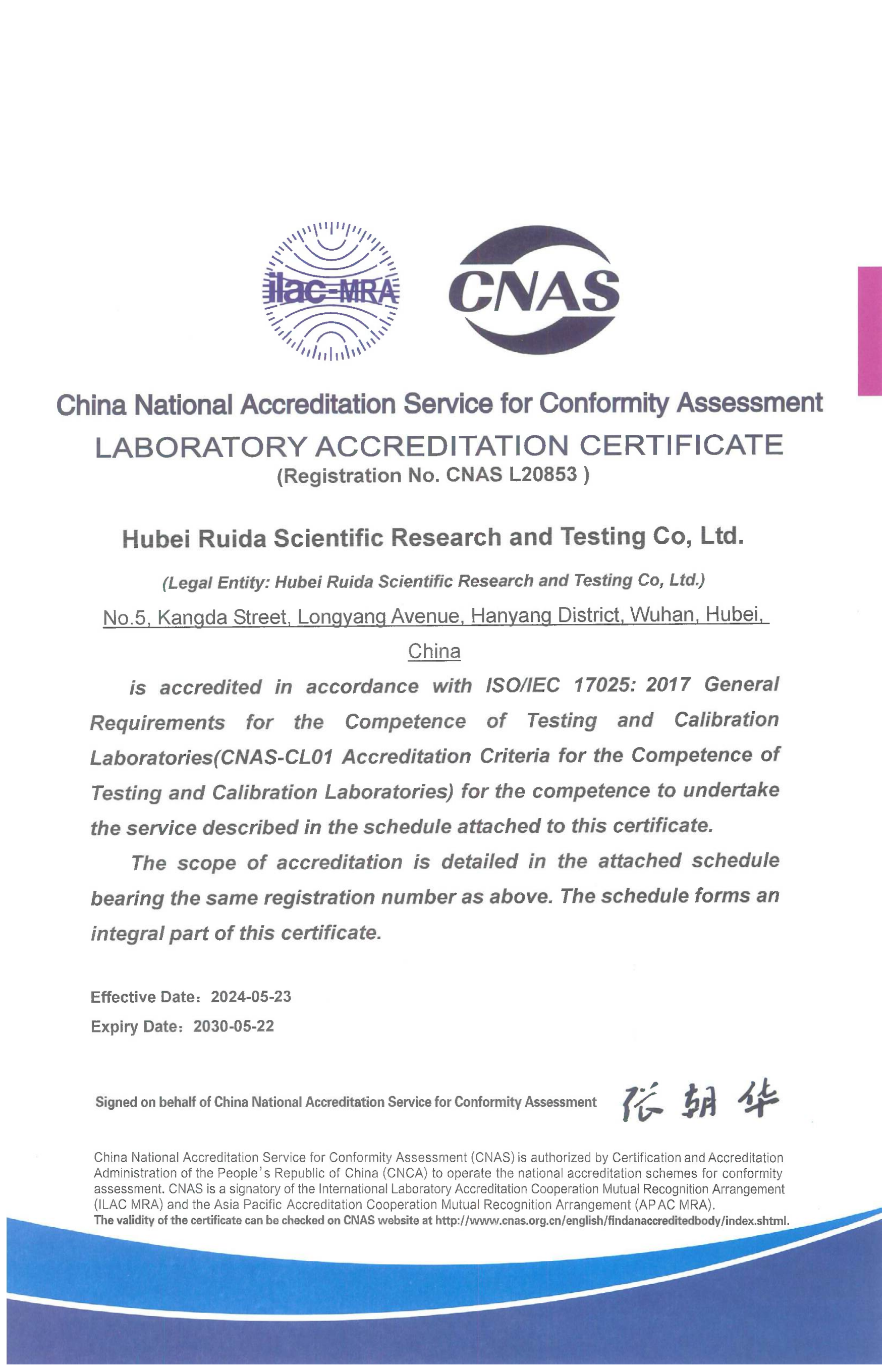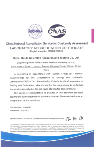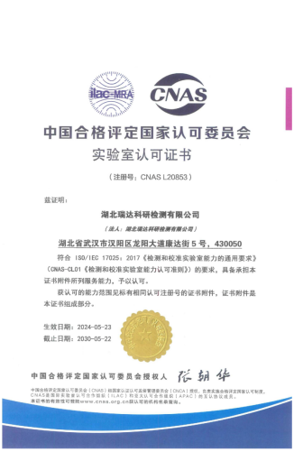 近日,湖北路桥瑞达检测公司顺利通过中国合格评定国家认可委员会(CNAS)各级审核,取得“实验室认可证书”,标志着湖北路桥瑞达检测公司首次跻身国家级认可实验室行列,具备按照有关国际认可准则开展检测服务的能力。