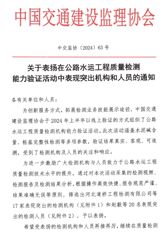 近日,中国交通建设监理协会发布《关于表扬在公路水运工程质量检测能力验证活动中表现突出机构和人员的通知》,湖北路桥旗下的瑞达检测公司荣获“表现突出机构”称号,且是湖北省内唯一获得表彰的检测单位。