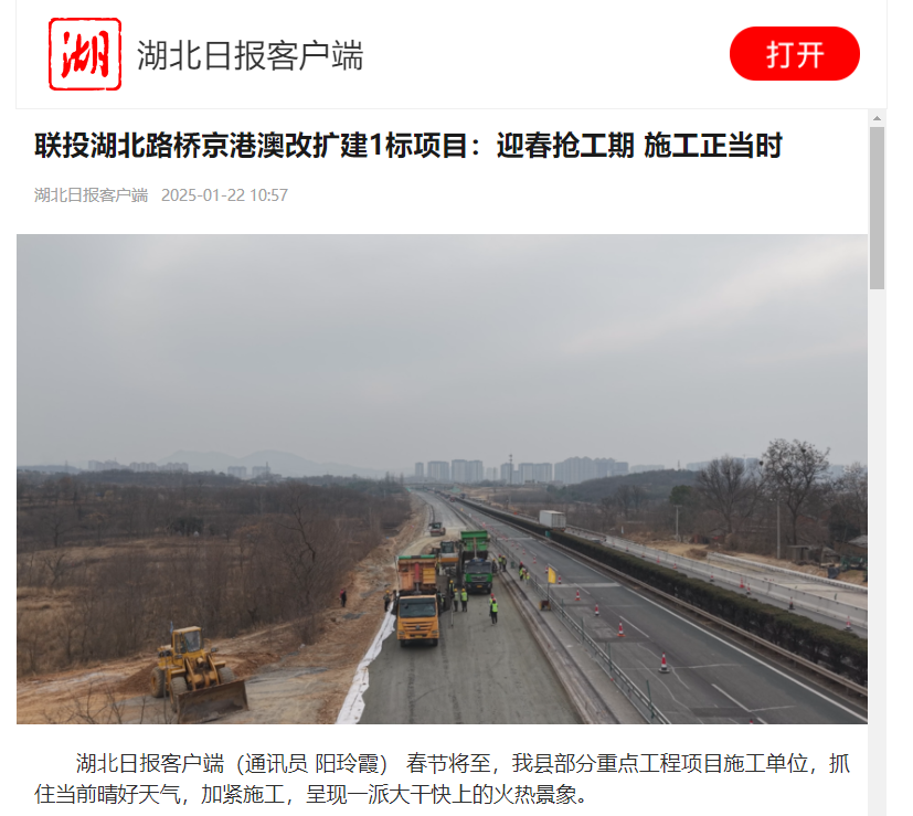 1月22日,湖北日报报道了联投湖北路桥京港澳改扩建1标抢抓晴好天气,大干快上的火热景象,以下是报道全文:
