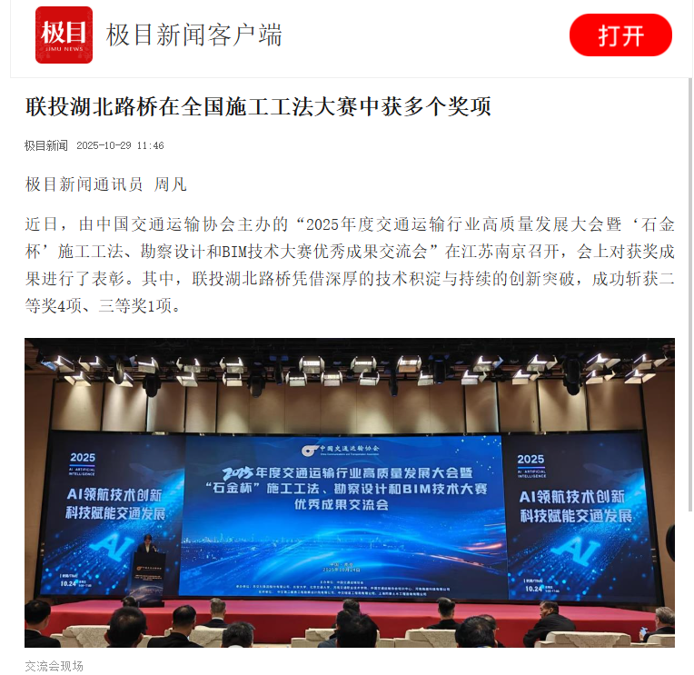 近日,由中国交通运输协会主办的“2025年度交通运输行业高质量发展大会暨‘石金杯’施工工法、勘察设计和BIM技术大赛优秀成果交流会”在江苏南京召开,联投湖北路桥荣获多个奖项,极目新闻对此事件进行报道,以下是报道全文: