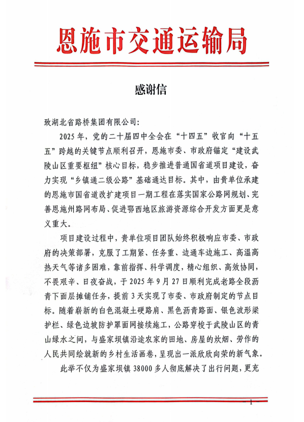 这封感谢信,不仅是对湖北路桥的认可,更是向每一位为打通武陵山区“咽喉要道”而奋战的建设者辛苦攻坚的肯定。短短两页纸,承载着盛家坝镇3.8万群众“出门走上沥青路”的多年梦想,也为湖北路桥在鄂西版图再添一枚“荣誉勋章”。这既是对项目管理水平、施工实力与企业品牌的有力印证,也体现了政企同心、协力攻坚的深厚情谊。
