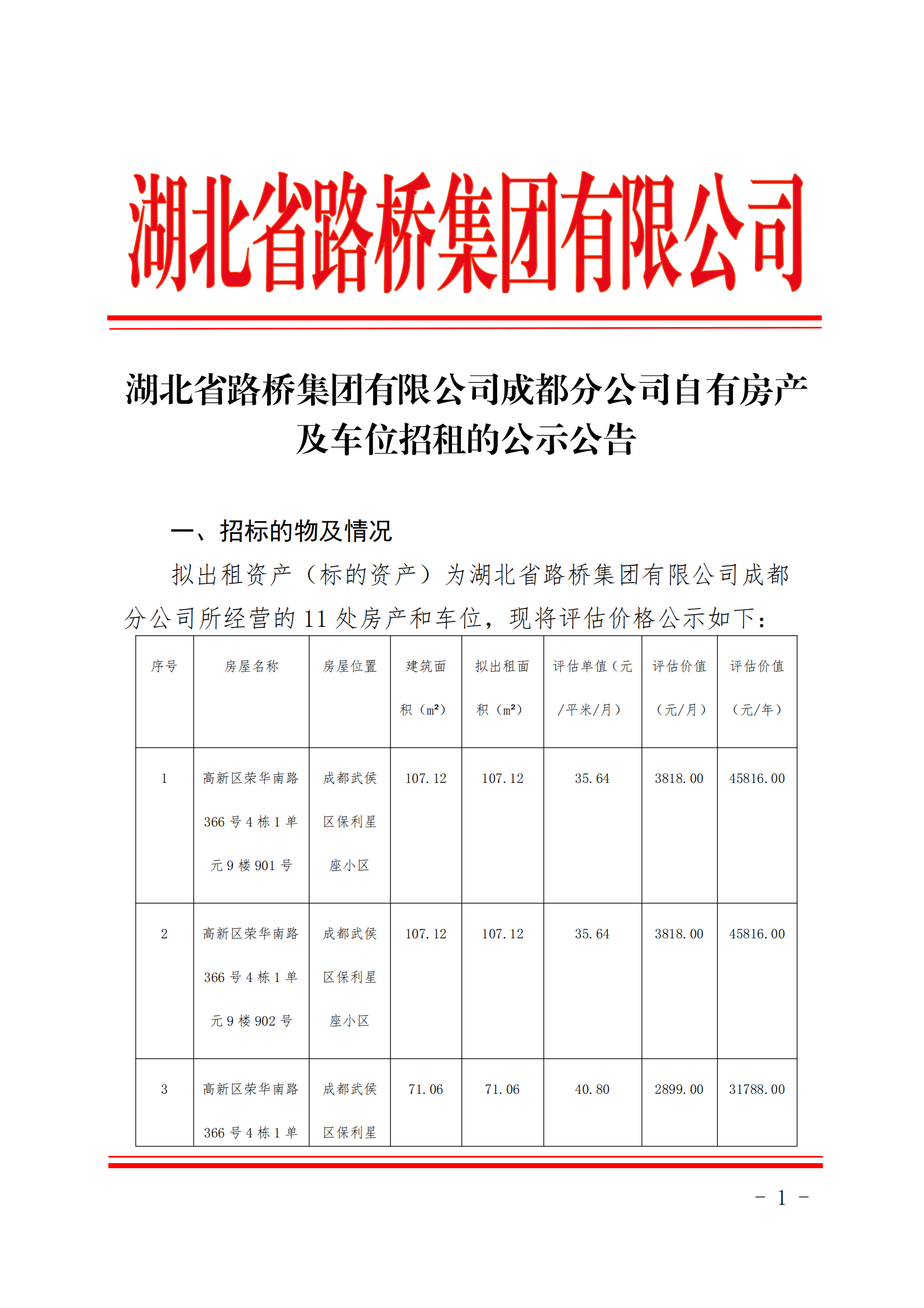 湖北省路桥集团华晟通建设工程有限公司自有房产招租公告